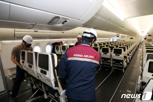 아시아나항공 직원들이 A350 개조 화물기 1대에 다시 좌석을 장착하며 여객기로 원상 복원하는 개조 작업을 하고 있다. (아시아나항공 제공) © 뉴스1 |