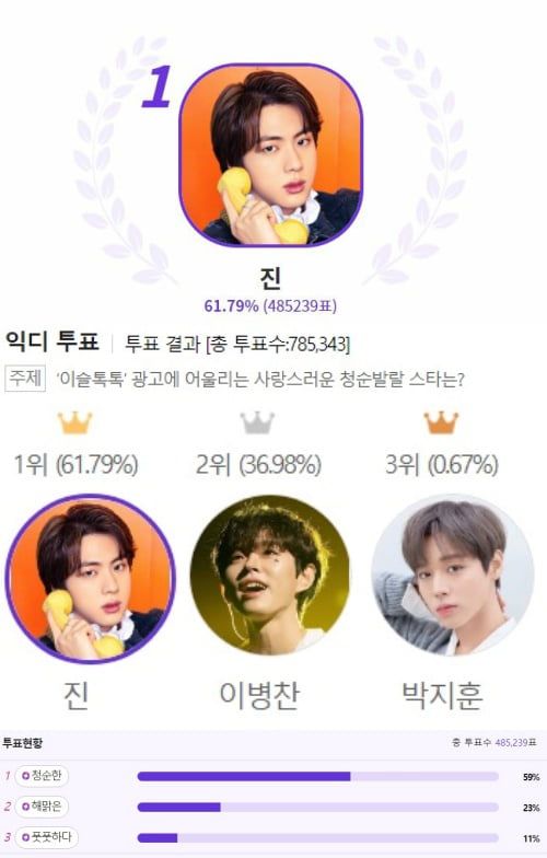방탄소년단(BTS) 진이 '이슬 톡톡' 광고에 어울리는 사랑스러운 스타 1위에 선정됐다.