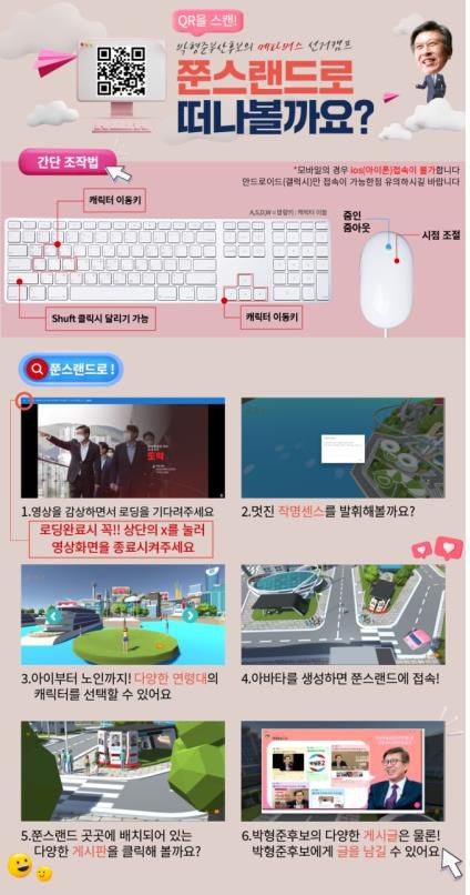 쭌스랜드는 기존 메타버스 플랫폼을 활용하지 않고, 전국 최초로 자체 플랫폼을 활용한 메타버스 선거 캠프라고 박 후보 측은 설명했다.