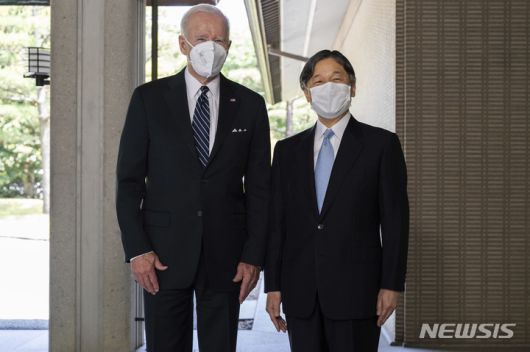 NHK 등에 따르면 바이든 대통령은 이날 오전 9시56분께 도쿄(東京) 소재 일왕 거처인 고쿄(皇居)에 도착했다. 나루히토 일왕은 현관에 나와 바이든 대통령을 맞이했다.