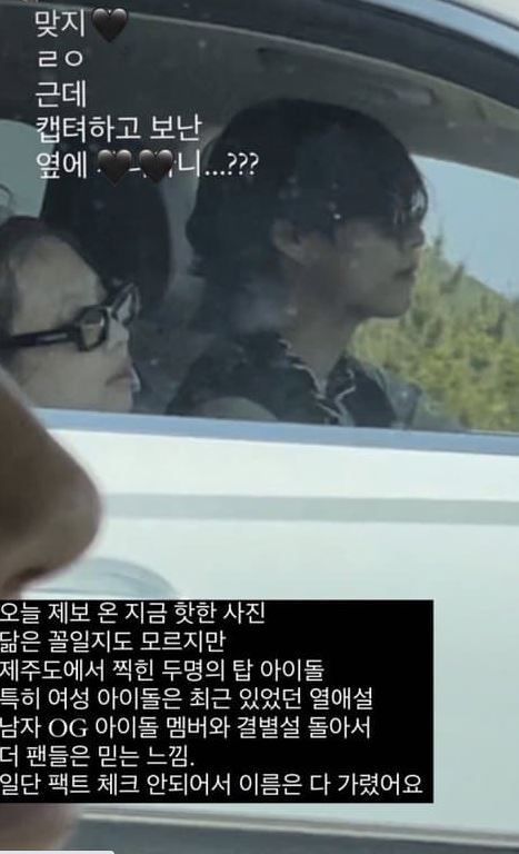 해당 글에는 제니와 뷔로 보이는 여성과 남성의 사진이 게재돼 있어 눈길을 끌었다. 두 사람 모두 선글라스를 착용하고 있다. 남성은 운전석에, 여성은 조수석에 앉아있는 모습이다.