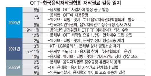 음저협 관계자는 “유권해석이 나온 뒤 OTT 요구로 단체협상에 임했지만 과거와 동일한 주장을 되풀이하면서 협상은 결렬된 상태”라며 “OTT가 징수규정에 따라 적법한 저작권료를 지급해야 한다는 권리자 입장은 변함없다”고 역설했다.