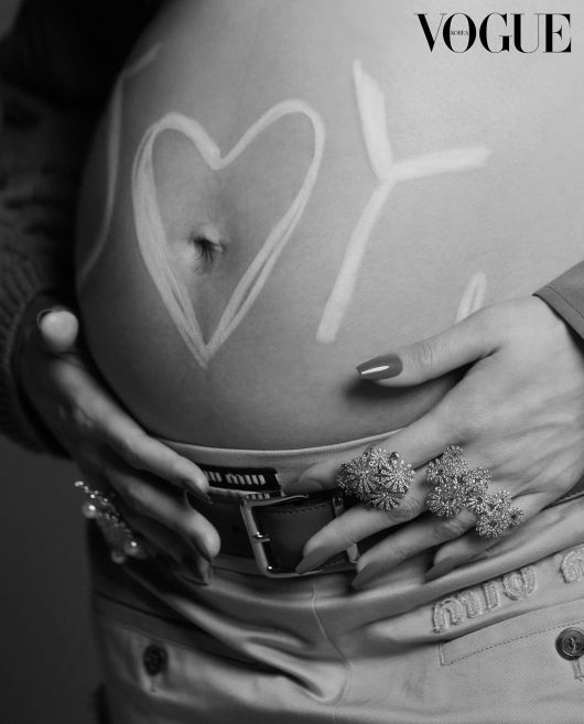 공개한 사진은 매거진 보그 코리아와 함께 한 만삭 화보다. 이하늬는 나온 배를 과감하게 드러내며 다양한 의상을 입고 당당하게 포즈를 취했다. 특히 'JOY'라고 태명을 쓴 배를 양손으로 소중하게 감싸 안은 포즈가 시선을 모은다.