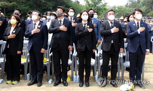 국기에 경례하는 여야 지도부 |