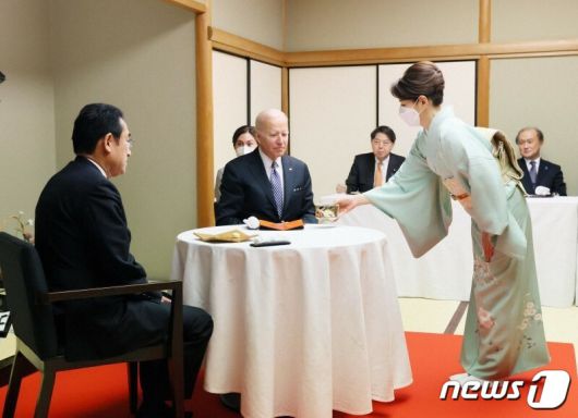 (서울=뉴스1) 김민수 기자 = 지난 23일 기시다 후미오 일본 총리와 조 바이든 미국 대통령이 도쿄 미나토구 시로가네다이의 핫포엔(八芳園)에서 저녁 만찬을 가졌다.
