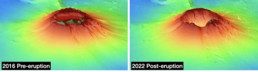 지난 1월 15일 폭발했던 통가화산 전후 모습을 담은 3D 지도가 공개됐다. [사진=극지연구소] |