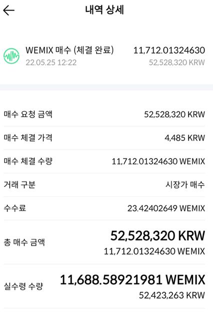 25일 위메이드는 공지사항을 통해 장현국 대표가 5월 급여로 위믹스 약 1만1688개를 매입했다고 밝혔다. 이번 위믹스 총 매수금액은 5252만8320원으로 평단가는 4485원이다.