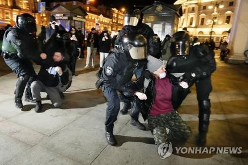 우크라이나 침공 반대 시위대 체포하는 러시아 경찰 |