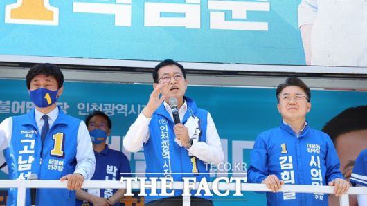 24일 민주당 박남춘 인천시장 후보가 연수구민 앞에서 연설을 통해 지지를 호소하고 있다. 사진/박남춘 후보 선대위 제공 |