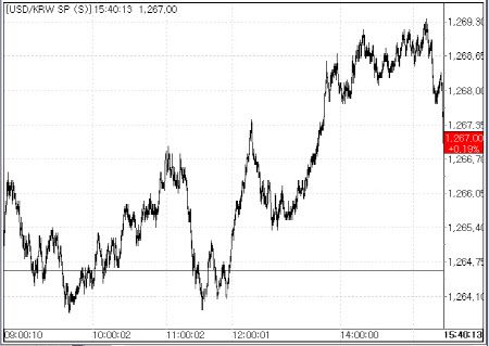 26일 서울외국환중개에 따르면 환율은 전 거래일 종가(1264.60원)보다 2.40원 오른 1267.0원에 거래를 마쳤다. 이날 환율은 0.90원 오른 1265.50원에 시작해 한국은행 금융통화위원회 결정이 발표되는 오전중 보합권 등락을 거듭했다. 오전 중 한 때는 장중 1263.80원까지 떨어지면서 하락하기도 했다. 그러나 중국 위안화 약세폭이 커진 오후들어서는 원화 약세 압력이 더 커지면서 상승세로 완전히 돌아섰다.