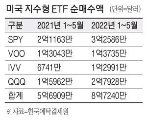 26일 한국예탁결제원 증권정보포털(세이브로)에 따르면 올해 1월부터 5월 25일까지 서학개미들은 미국 스탠더드앤드푸어스(S&P)500 및 나스닥100지수를 단순 추종하는 지수형 ETF를 총 8억7240만달러어치 순매수한 것으로 나타났다. 이는 전년 같은 기간 순매수액인 5억6909만달러 대비 53.3% 증가한 수치다. 지난해와 비교해 올해 서학개미들의 미국 주식 순매수액이 10%가량 증가했다는 걸 고려해도 지수형 상품에 투자하는 비중이 크게 높아진 셈이다. 올해 5월 지수형 상품 순매수액은 1억307만달러로 지난 4월과 비교해서도 54.6% 늘었다.