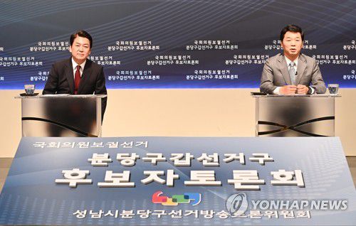 (성남=연합뉴스) 이우성 기자 = 경기 성남시 분당갑 국회의원 보궐선거에서 맞붙은 국민의힘 안철수 후보와 더불어민주당 김병관 후보가 26일 열린 TV 토론회에서 지역 현안과 공약 등을 놓고 설전을 벌였다.