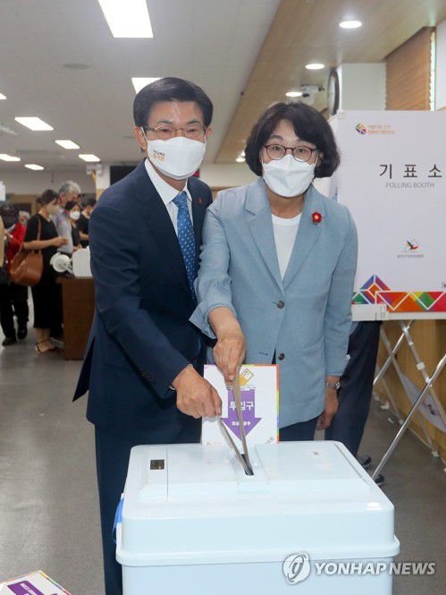 (제주=연합뉴스) 전지혜 기자 = 제8회 전국동시지방선거 사전투표 첫날인 27일 오전 이석문 제주도교육감 후보가 부인 송여옥씨와 함께 제주도의회 의원회관에 마련된 사전투표소에서 투표하고 있다. 2022.5.27 atoz@yna.co.kr ▶제보는 카카오톡 okjebo▶연합뉴스 앱 지금 바로 다운받기~▶네이버 연합뉴스 채널 구독하기 <저작권자(c)연합뉴스. 무단전재-재배포금지.>