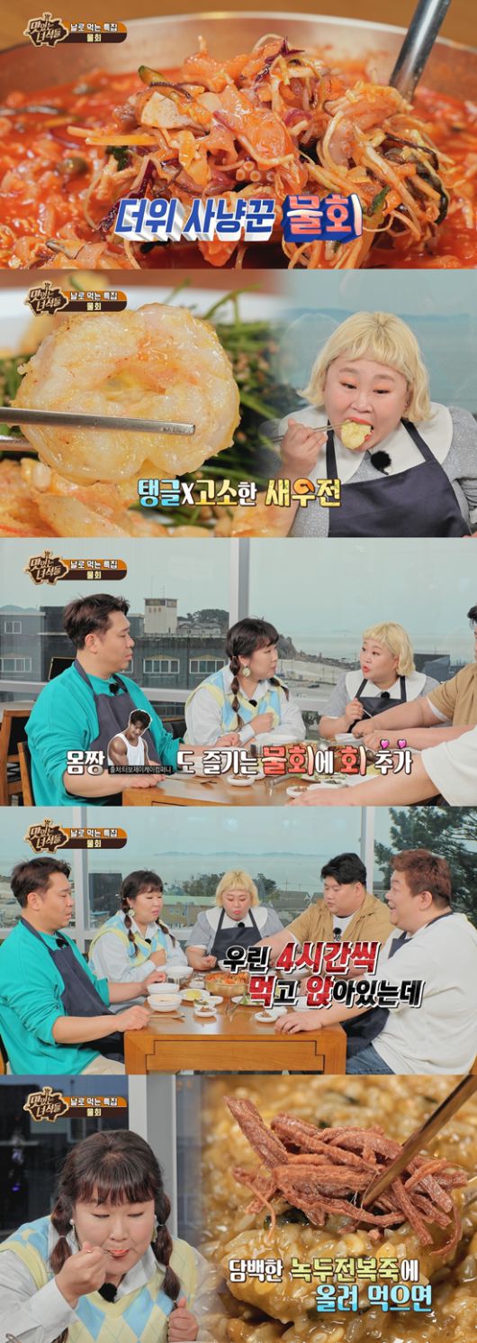 이후에도 육전과 새우전이 담긴 모둠전으로 끊임없는 먹방을 펼친 뚱5. 결국 물회 대(大) 2개, 소면 10개, 밥 3공기, 모둠전 2개를 먹은 이들은 마지막 입가심으로 녹두전복죽까지 해치워 스태프들을 놀라게 만들었다는 후문이다.