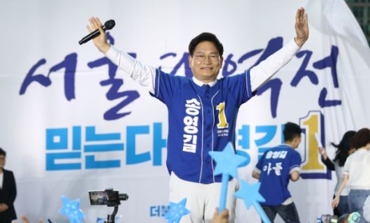 더불어민주당 송영길 서울시장 후보가 26일 오후 서울 청계광장에서 열린 '국정균형-민생안정 호소 2090 총결집 전국 동시 집중유세'에서 지지자들에게 손을 들어 인사하고 있다. 뉴시스 |