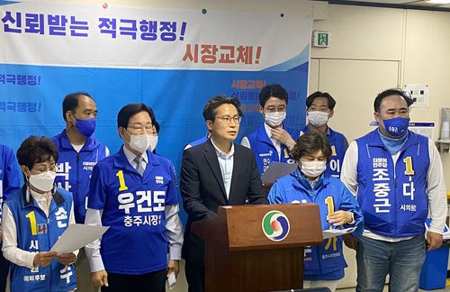 더불어민주당 충주지역위원회와 우건도 시장 후보 등 지방선거 후보들은 27일 시청에서 기자회견을 열어 "탄금대에서 음주·가무를 즐긴 것으로 드러난 국민의힘 조길형 시장 후보는 사퇴하라"고 요구했다.