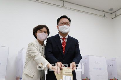 이장우 국민의힘 대전시장 후보(오른쪽)가 27일 부인 김세원씨와 함께 대전시청 1층에 마련된 둔산1동 투표소를 찾아 제8회 전국동시지방선거 사전투표를 하고 있다. (사진=이장우 대전시장 후보 선거사무소 제공) |