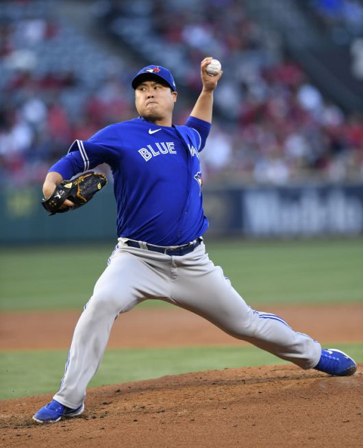 토론토 류현진이 27일(한국시간) 미국 캘리포니아주 애너하임 에인절스타디움에서 투구하고 있다. 애너하임 | AFP연합뉴스 |