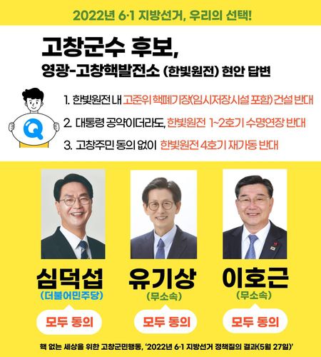 세 후보는 ▲한빛원전 내 사용후핵연료 저장시설(임시저장시설 포함) 건설 ▲한빛원전 1∼2호기 수명연장 ▲고창주민 동의 없는 한빛원전 4호기 재가동 등 모든 안건에 대해 '반대' 입장을 밝혔다.
