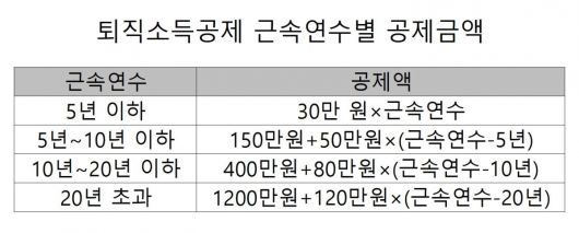 현재 근속연수별 공제금액은 근속 기간별로 구간을 두고 차등 적용한다. 근속연수가 5년 이하면 30만 원, 5년 초과 10년 이하는 50만 원, 10년 초과 20년 이하는 80만 원, 20년 초과는 120만 원을 각각 공제하는 방식이다.