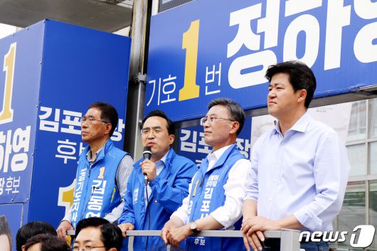 박 원대대표는 29일 김포한강신도시 장기역 유세에서 "지난 4년간 정하영 김포시장이 정말 많은 일을 해냈다. 제가 다 기억하지 못할 정도의 탁월한 성과를 낸 사람이 바로 정하영 김포시장"이라며 "김포 발전을 도약시켜온 정하영이 더 달라진, 더 변화하는 희망의 김포 만들어야 하지 않겠나"라고 지지를 호소했다.