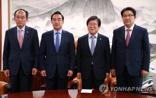 회동하는 박병석 국회의장, 권성동ㆍ박홍근 원내대표, 추경호 경제부총리 |