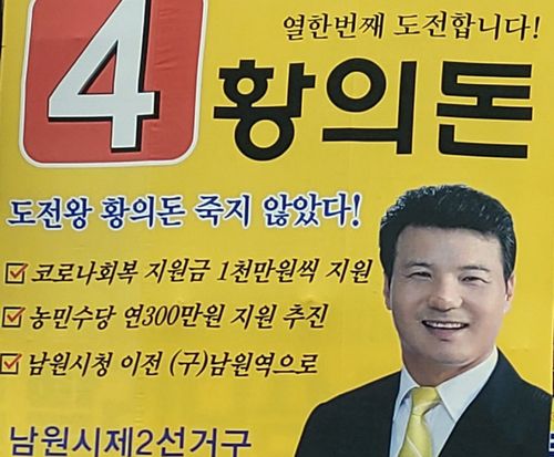황 후보는 30일 연합뉴스와 통화에서 "그동안은 실패의 연속이었다"면서 "하지만 이번에 지더라도 승리할 때까지 계속 출마할 생각"이라고 말했다.