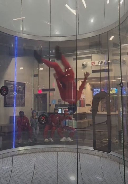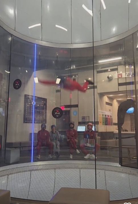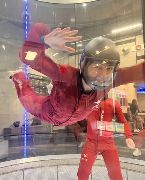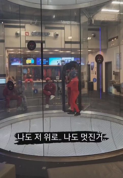공개된 사진 속 뷔는 실내형 스카이다이빙 스매시 에어를 즐기고 있다. 이어 영상도 함께 공개했다. "나도 저 위로..나도 멋진거"라는 글도 덧붙였다.
