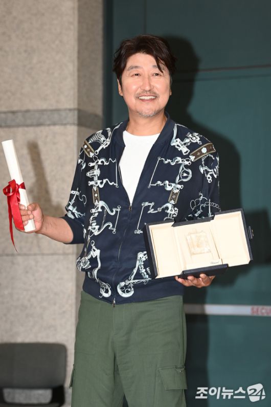 송강호는 이번 칸국제영화제에서 감독상을 수상한 박찬욱 감독에 대한 축하도 잊지 않았습니다. 그는 "박찬욱 감독과는 20년 지기고, 오랫동안 영화를 작업해온 영화적 동지"라며 "친형과 다름없는 존경하는 감독이다. 평소 만났을 때도 작품 이야기를 많이 하지만, 딱 정해놓고 언제 다시 작품을 하자 약속을 하기 보다는 심적으로 서로를 응원해준다. 박 감독의 수상 너무 축하드린다"라고 인사했습니다.