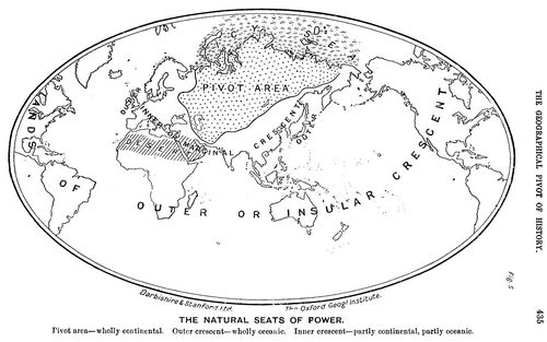 그는 또 "러시아는 핀란드로, 스칸디나비아로, 폴란드로, 터키로, 페르시아로, 인도로, 최근에는 중국으로 차례차례 압박을 가하고 있다"며 "독일이 유럽에서 그러하듯 러시아가 세계 전체와의 관계에서 전략상 중추의 지위를 점하고 있다고 할 수 있다"고 분석했다.