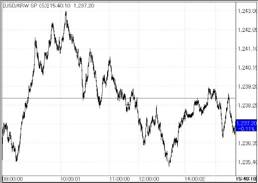 31일 서울외국환중개에 따르면 환율은 전 거래일 종가(1238.60원)보다 1.40원 하락한 1237.20원에 거래를 마쳤다. 이날 환율은 전일 대비 3.60원 내린 1235.0원에 시작해 2원 안팎의 낙폭을 보이다가 저가매수 수요에 오전 11시께 1243.10원까지 오르며 상승 반전하기도 했다. 그러나 결제 물량이 소화된 뒤에는 글로벌 달러화 약세, 중국 위안화 약세 등에 연동하면서 다시 하락 반전해 마감했다. 종가 기준으로는 27일 이후 사흘 연속 내린 것이며, 전날에 이어 이틀 연속 1230원대에서 하락세를 기록한 것이다.