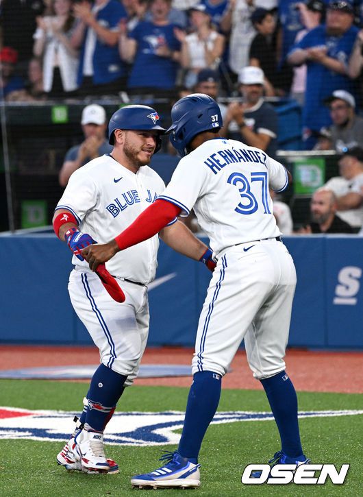 [OSEN=토론토(캐나다 온타리오주), 최규한 기자]5회말 2사 2루 상황 토론토 알레한드로 커크가 오늘 경기 두 번째 투런포를 쏘아올리고 홈을 밟으며 선행주자 테오스카 에르난데스와 인사를 나누고 있다. 2022.06.01 / dreamer@osen.co.kr |