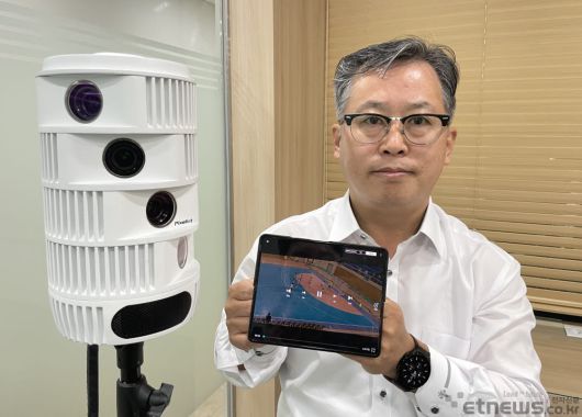 전영생 와이에스티 대표가 경기도 용인 본사에서 자사 아마추어 경기 전문 스포츠 온라인동영상서비스(OTT) AI 스포츠 TV 경기장면을 소개하고 있다. 왼쪽은 스포츠 경기 촬영에 이용되는 AI 카메라. |