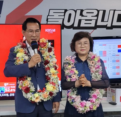 지지자들에게 꽃다발 받고 인사하는 이완섭 서산시장 당선인 부부 |