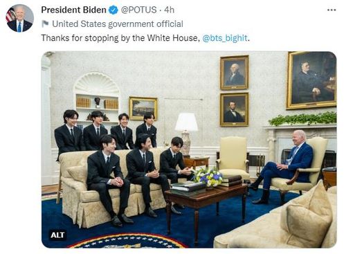 바이든 대통령은 이날 낮에도 트위터에 "백악관을 찾아줘서 감사하다"는 글과 함께 BTS와 대화하는 사진 한 장을 게시하기도 했다.