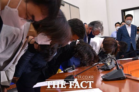 윤호중, 박지현 더불어민주당 공동비상대책위원장 등 비대위원들이 2일 오전 서울 여의도 국회에서 지방선거 결과에 책임을 지고 비상대책위원회 일동의 사퇴를 발표하며 고개숙이고 있다. /국회=남윤호 기자 |