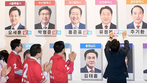 2일 중앙선거관리위원회 개표 완료 결과, 국민의힘은 ▲ 서울(오세훈) ▲ 인천(유정복 ▲ 충북(김영환) ▲ 충남(김태흠) ▲ 세종(최민호) ▲ 대전(이장우) ▲ 대구(홍준표) ▲ 경북(이철우) ▲ 부산(박형준) ▲ 울산(김두겸) ▲ 경남(박완수) ▲ 강원(김진태)에서 승리했다.