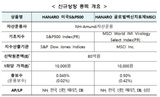 같은 날 NH-Amundi자산운용은 ‘HANARO 미국S&P500’ ETF도 상장한다. 기초지수는 S&P500 Index(PR)이다.