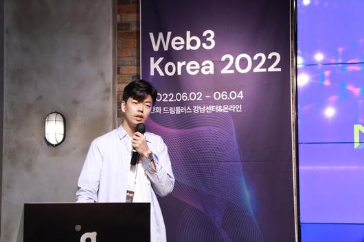 3일 서울 서초구 드림플러스 강남센터에서 열린 '웹3 코리아 2022'에서 홍진표 마브렉스(넷마블 블록체인 계열사) 매니저는 MBX 생태계를 소개하며 RF 프로젝트에 블록체인 기술이 적용된다고 밝혔다.