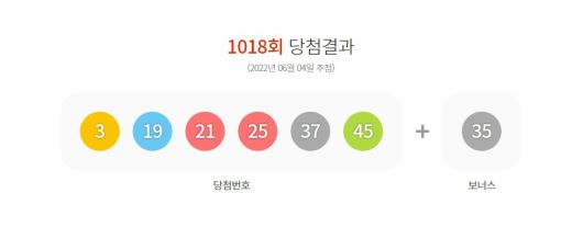 로또복권 운영사 동행복권은 제1018회 로또복권 추첨에서 ‘3, 19, 21, 25, 37, 45′가 1등 당첨번호로 뽑혔다고 4일 밝혔다. 2등 보너스 번호는 ‘35′다.