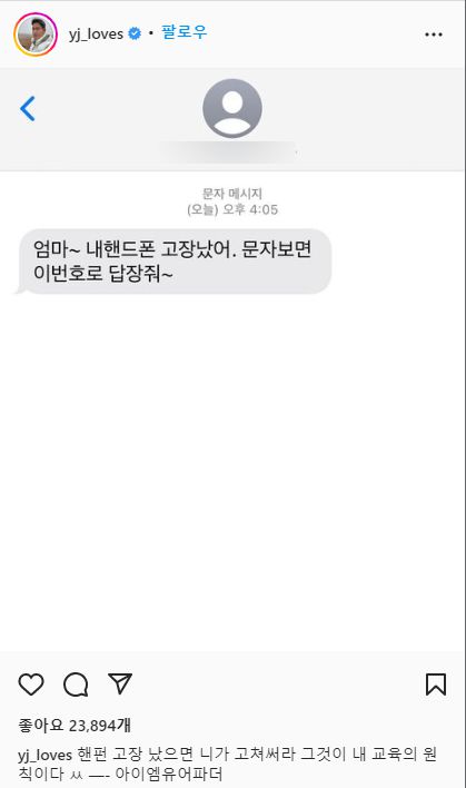 정 부회장은 지난 6일 자신의 인스타그램에 문자 화면 캡처사진을 올렸다. 문자 메시지에는 ‘엄마 내 핸드폰 고장 났어. 문자 보면 이 번호로 답장 줘’라는 내용이 담겼다.