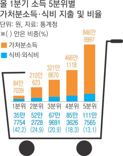 1분위의 가처분소득 대비 식비 지출 비중은 지난해 1분기 46%에서 올 1분기 42.2%로 소폭 감소했다. 하지만 이는 가처분소득이 지난해 1분기 72만7865원에서 올해 84만7039원으로 크게 늘었기 때문이다. 식비 지출만 놓고 보면 지난해 1분기 1분위 가구의 월평균 식료품비 지출은 24만2866원이었는데 1년 새 1만원 가까이 늘었고, 외식비는 9만5261원에서 10만5971원으로 10% 넘게 증가했다.