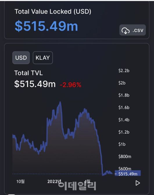 [이데일리 김국배 기자] 올 들어 호조세를 보였던 카카오(035720)의 블록체인 플랫폼인 ‘클레이튼’ 기반 디파이(DeFi·탈중앙화 금융) 총 예치금(TVL)이 급감했다. 최근 클레이튼 기반 디파이 서비스들이 청산을 결정하는 등 클레이튼 생태계가 자체가 위축된 여파라는 분석이 나온다.