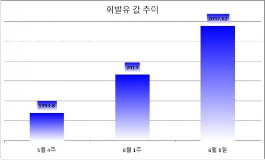 8일 한국석유공사 유가정보서비스 오피넷에 따르면 이날 오전 8시 기준 전국 평균 휘발유 가격은 리터당 2037.62원으로 전일 대비 1.88원 올랐다. 휘발유 가격은 5월 4주 1993.8원, 6월 1주 2013원을 기록하는 등 꾸준히 상승하고 있다. 경윳값은 리터당 2030.24원으로 전일보다 2.28원 올랐다.