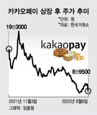 8일 코스피 시장에서 카카오페이는 전일 대비 1만6500원(15.57%) 폭락한 8만9500원에 거래를 마쳤다.