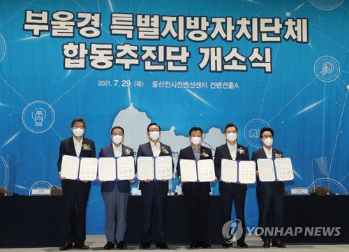 지난해 7월 29일 오후 울산시 울주군 울산전시컨벤션센터에서 열린 부울경 특별지방자치단체 합동추진단 개소식에서 부산·울산·경남 지자체와 지방의회 대표들이 특별지방자치단체 설치 협약을 맺고 기념 촬영하고 있다. [연합뉴스 자료사진] |