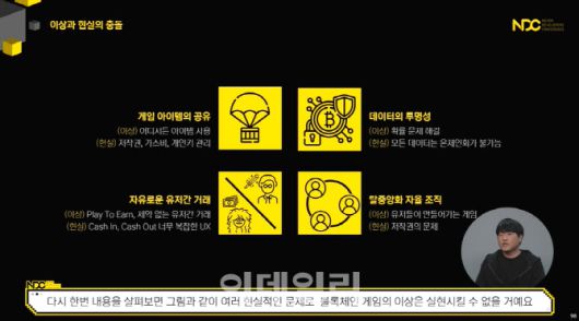 넥슨코리아 인텔리전스랩 소속 류기혁 개발자는 9일 NDC에서 ‘돈 버는(P2E·플레이투언) 게임’을 언급하면서 “단순히 유저들의 캐시아웃(현금화)를 도와주는 시스템이 아닌데 마케팅 용어로 사용되는 등 지금 시장은 본질을 잊은채 시작되고 있는거 같다”고 시장 현황을 짚었다.