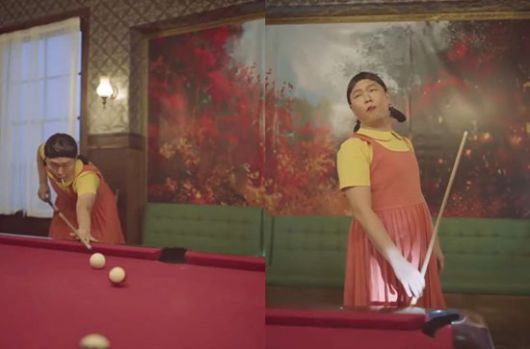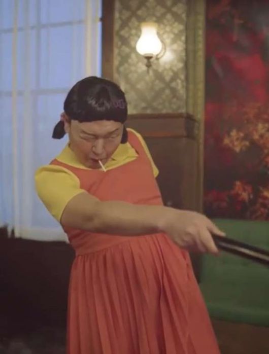 공개된 영상 속 싸이는 전 세계적으로 큰 인기를 끈 넷플릭스 '오징어게임' 속 영희 인형으로 변신한 모습이다. 헤어스타일부터 옷까지 극중 영희 인형과 싱크로율 100%다.