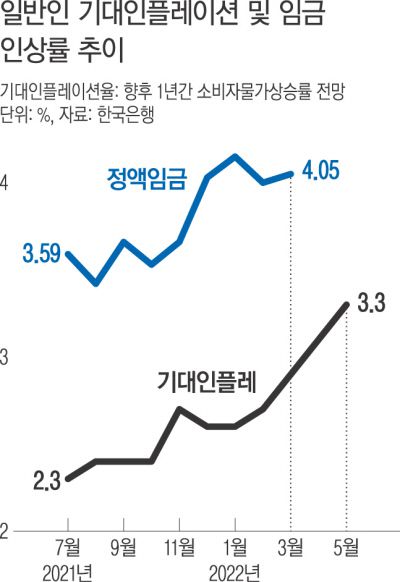 일반인들이 예상하는 향후 1년 소비자물가 상승률에 해당하는 기대인플레이션은 지난 1월 2.6%에서 가파르게 상승해 지난달 3.3%를 기록했다. 사람들이 향후 물가가 더 오를 것이라고 판단하고 있다는 의미다. 실질소득이 줄어들게 된 근로자들이 임금 인상을 요구하고, 기업들도 제품가격에 반영하기 시작해 물가를 또다시 끌어올리는 순환 고리가 만들어지고 있는 것이다.