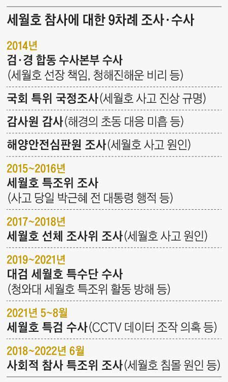 하지만 이후에도 ‘잠수함 충돌설’ 같은 괴담과 의혹 제기가 이어지면서 재조사와 수사가 이뤄졌다. 2019년 11월에는 윤석열 당시 검찰총장 지시로 검찰 특수단이 출범해 1년 2개월 동안 총 201명을 대상으로 269회에 걸쳐 조사를 진행하기도 했다. 세월호 특수단은 수사를 통해 ‘해경 구조 실패’ ‘청와대의 세월호 특조위 활동 방해’ 등과 관련해 10명을 추가로 기소하기도 했다.